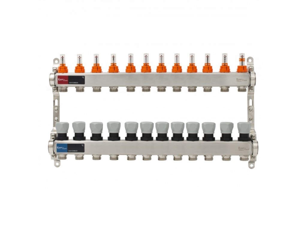 Zostava rozdeľovač/zberač s prietokomerom, INOX 12 cestný 1”x3/4”
