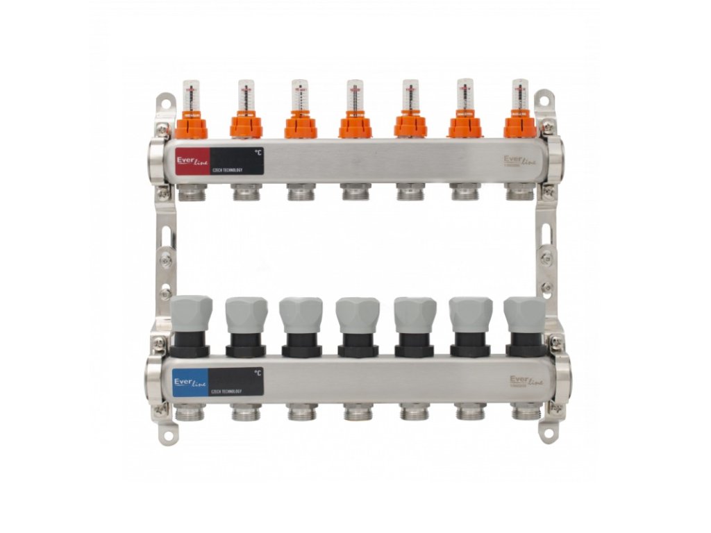 Zostava rozdeľovač/zberač s prietokomerom, INOX 7 cestný 1”x3/4”