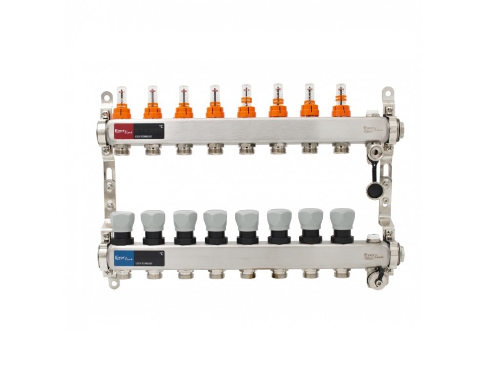 Zostava rozdeľovač/zberač s prietokomerom, s odvzdušňovacím a vypúšťacím ventilom, INOX 8 cestný 1”x3/4”